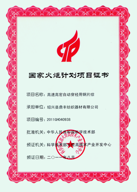 浙江鼎豐紡織器材有限公司始建于1986年,是一家專業(yè)生產(chǎn)各類無梭織機(jī)用鋼筘:噴氣筘、噴水筘、劍桿筘、其他類型鋼筘;鋁合金綜框、鋼片綜、停經(jīng)片、經(jīng)軸、織軸、卷布輥等產(chǎn)品及配件的民營企業(yè)。